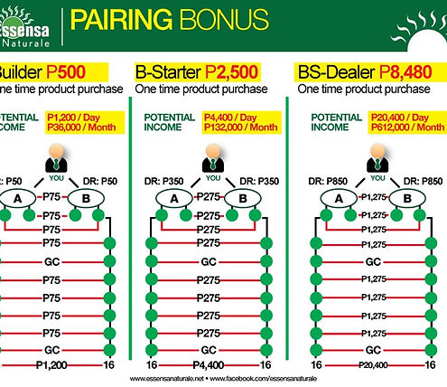3. Pairing Bonus – kapag may na recruit kang Dealer sa Left Side mo, at isang dealer sa Right Side mo, ikaw ay kikita ng Pairing Bonus na: P1,275 Pesos (One Thousand Two Hundred Seventy Five Pesos)